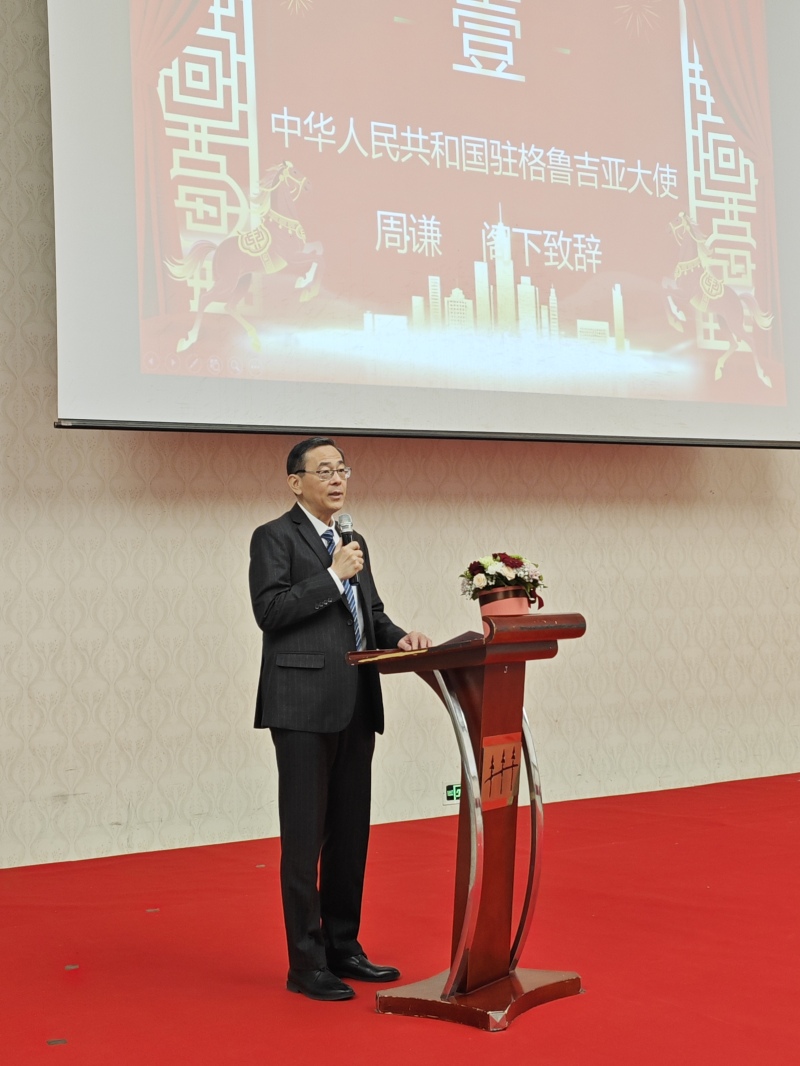2026年1月28日,驻格鲁吉亚大使周谦出席格鲁吉亚中资企业商会2026年新春年会并致辞,商会会员代表和使馆相关工作人员等约150人出席。